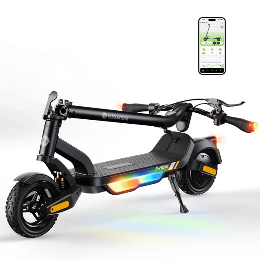 A S Nova a biztonságot minden körülmények között elsődlegesnek tekinti, ezért a legmodernebb világítási technológiával készült. Az erőteljes LED első lámpa akár 50 méterre is kivilágítja az utat, míg a hátsó LED féklámpák automatikusan jelzik a fékezést a mögötted haladóknak. A dinamikus ambiens világítás a roller oldalain nemcsak látványos, hanem praktikus is: oldalról érkező forgalomban is jól észrevehetővé tesz. A bal és jobb irányjelzők egyértelműen kommunikálják a kanyarodási szándékot, a beépített elektromos csengő pedig hangos figyelmeztetéssel segíti a biztonságos közlekedést. Mindez egyénileg vezérelhető az iSinwheel Club applikáción keresztül.