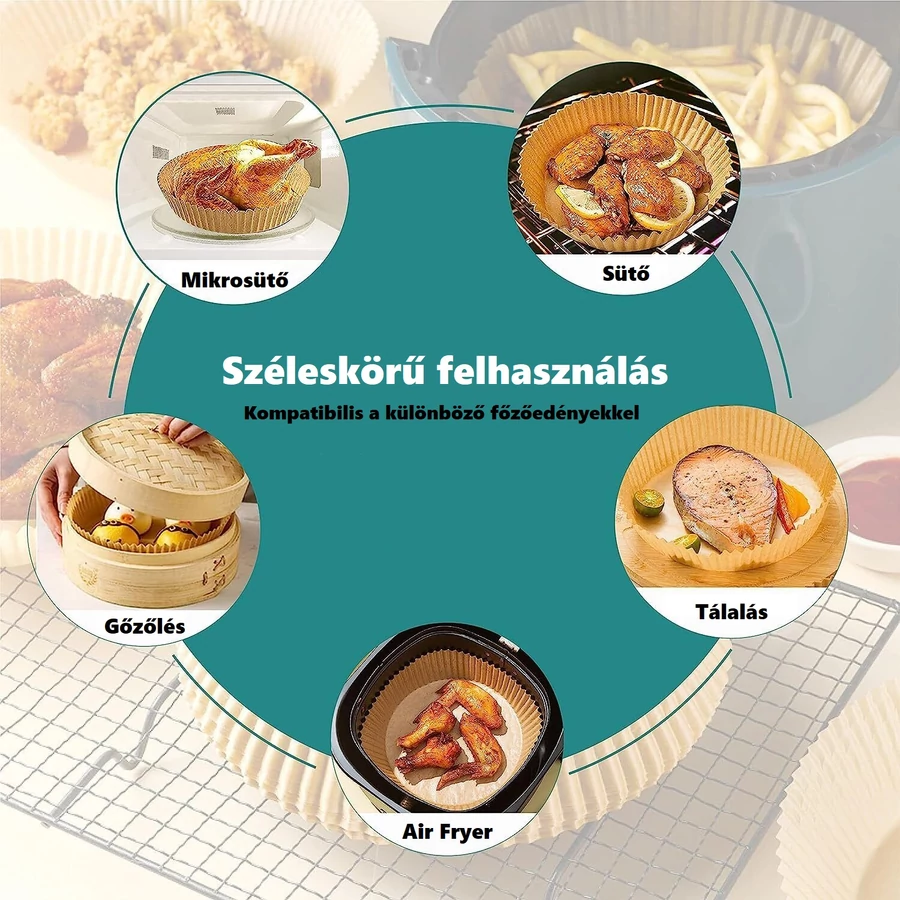 Légsütőpapírunk használható sütéshez, pörköléshez, pirításhoz vagy élelmiszerek tárolására, alkalmas légsütőkhöz, mikrohullámú sütőkhöz, tortaformákhoz, edényekhez, gőzölőkhöz és sütőkhöz stb. Otthoni sütés, kempingezés, grillezés, party box.